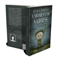“A melancholic cartoon character stands amidst swirling clouds and plants on a book cover with a grayish blue background.”