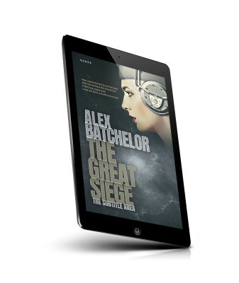 “A futuristic cover with a woman in a metallic helmet, staring ahead. The background is dark and space-like, with swirling clouds.”