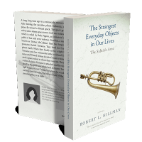 “A brass instrument on a white background resembling a book cover.”