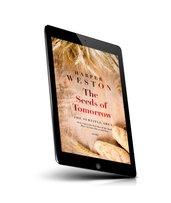 “A wooden surface with wheat stalks and bread, featuring a book cover titled "The Seeds of Tomorrow" by Harper Weston.”