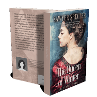 “A woman in vintage attire with hair up and a pearl necklace, set against a textured, wintry background.”