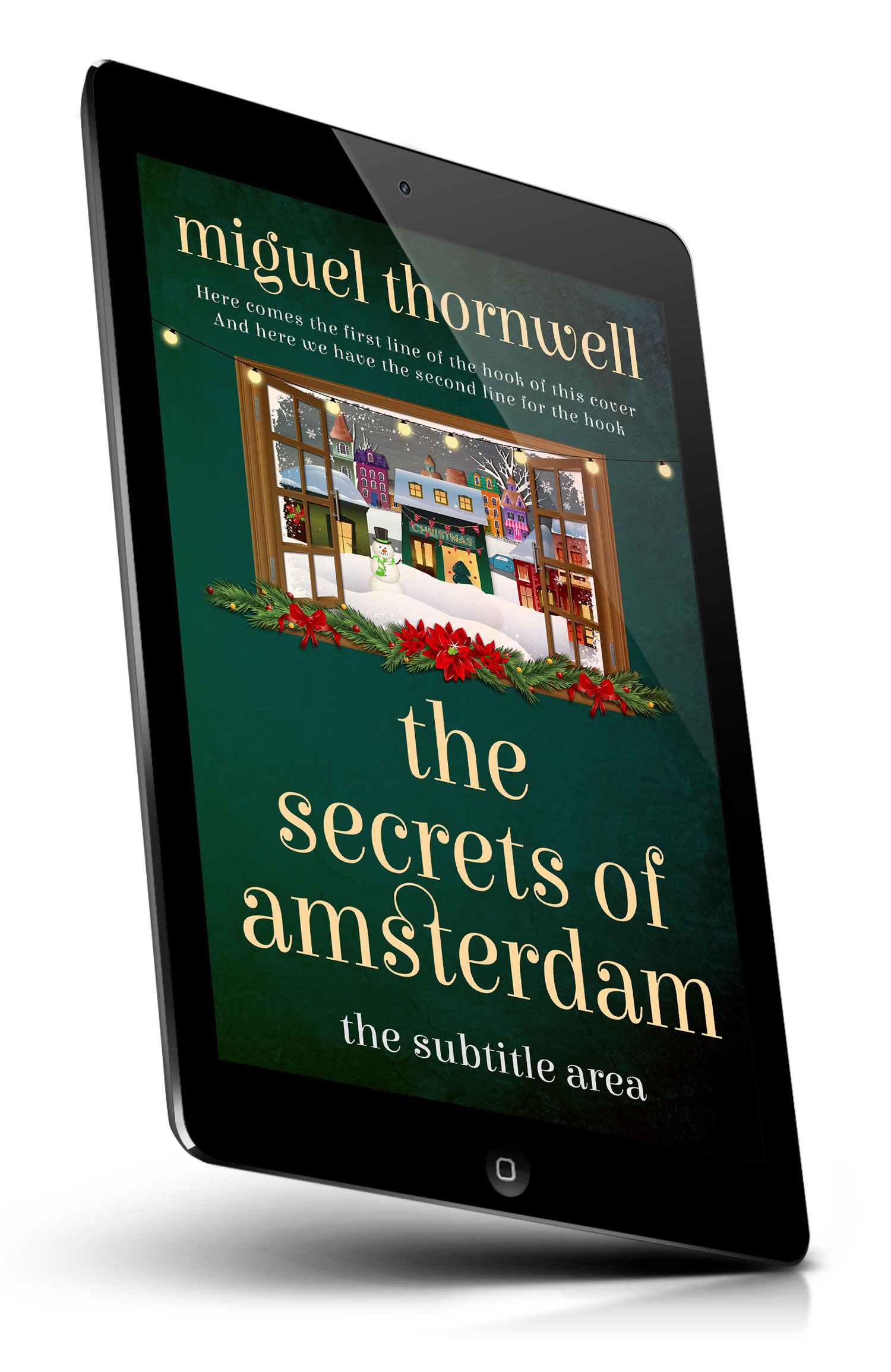 Tags: winter, snowfall, snowy village, open window, window view, festive lights, string lights, evergreen garland, pine branches, red ribbons, poinsettias, holly berries, snowman, cozy, holiday, christmas decor, colorful houses, european town, night sky, warm glow, premade cover, book cover design, self-publishing, ebook cover, print ready