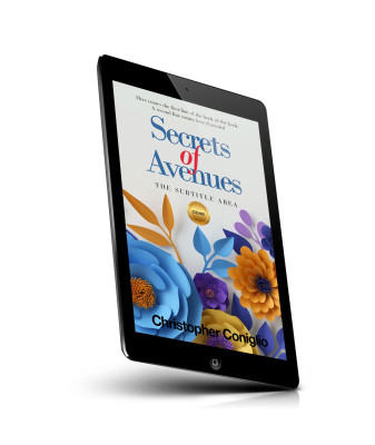 “A book cover with colorful paper flowers and the title "Secrets of Avenues" with author name "Christopher Coniglio."”