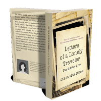 “A vintage-styled book cover titled "Letters of a Lonely Traveler" by Clyde Stevenson, featuring aged paper and a "A Novel" badge.”