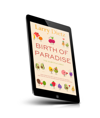 “Colorful fruits and vegetables with faces and hearts surround the title "Birth of Paradise".”