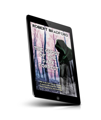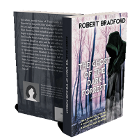 “A hooded figure stands amidst a dark, misty forest with tall, twisted trees.”
