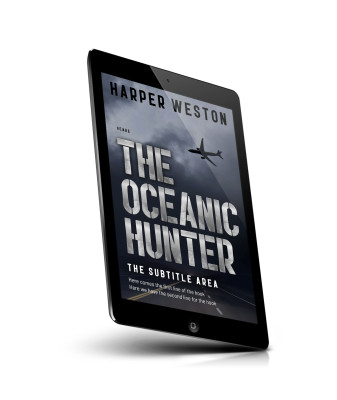 “An airplane flies over a dark, stormy ocean with "The Oceanic Hunter" in bold, metallic letters.”