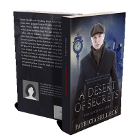 “A man in a coat, scarf, and flat cap stands against a backdrop of a clock and a train at night. Book title "A Desert of Secrets" is prominent.”