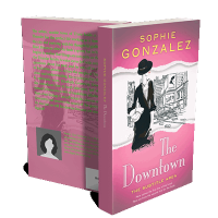 “A stylish woman in a black dress and hat stands against a city backdrop, with a pink and white design.”