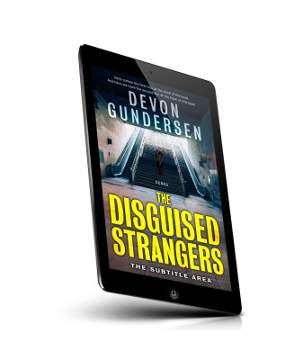 “A person descends stairs in an eerie, dimly-lit subway station with the title "The Disguised Strangers" in bold yellow text.”