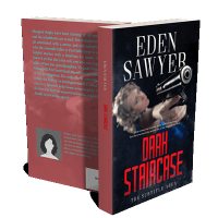 “A woman points a handgun towards the viewer. The background is black, and the mood is intense. Bold text features the title "Dark Staircase."”