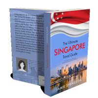 “A travel guidebook cover features a Singapore skyline, a modern building by the water, and the Singapore flag at the top.”