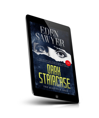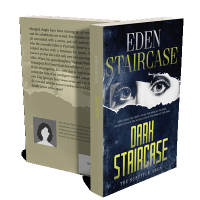 “Mysterious eyes peer through a torn, dark-paper background with bold yellow title "Dark Staircase" below.”