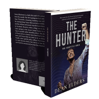 “A rugged man with a clenched fist appears determined against a dark background, drenched in sweat and grime. "The Hunter" is in bold text above.”