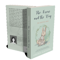 “Two rabbits, one standing and embracing the other, surrounded by a leafy wreath on a pale greenish background.”