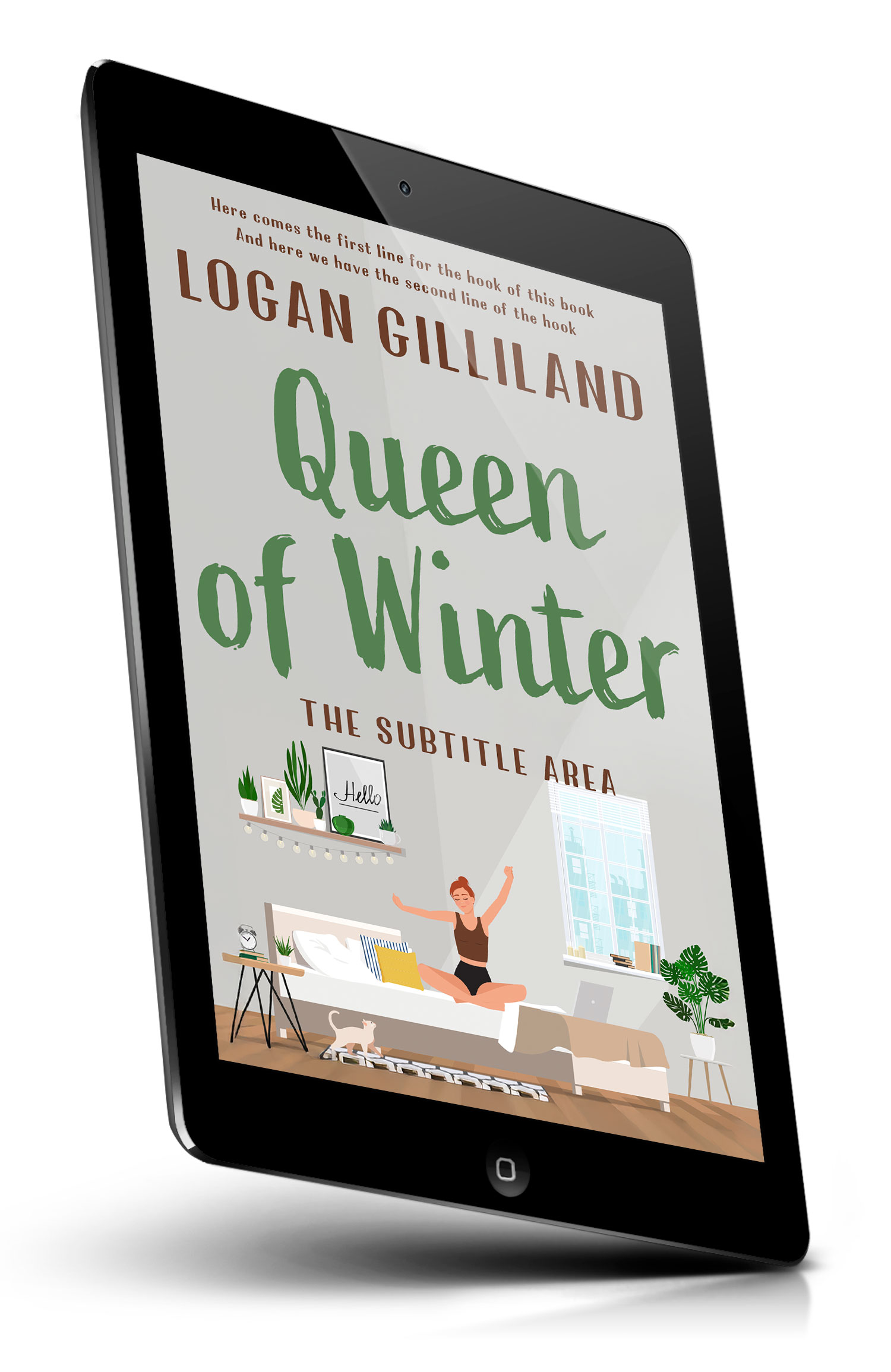 “Illustrated book cover of a woman stretching on a bed in a cozy bedroom with plants, a window, a cat, and a laptop.”