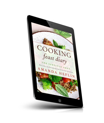 “A plate of grains, broccoli, tomatoes, and basil leaves, topped with a cooking book cover.”