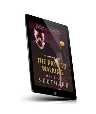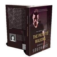 “A man with a serious expression stands in a dark, gloomy urban setting on the cover of a book titled "The Path to Walking".”