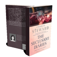 “A spaceship orbits a planet in a cosmic background, combined with sleek typography and layout for the book cover "The Seclusion Diaries".”