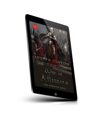 “Armored knights wielding swords and shields charge into battle; dark and intense atmosphere.”