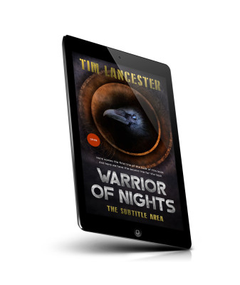 “A raven is centered inside a circular frame with a dark, mystical background design. The book's title, "Warrior of Nights," is prominent.”