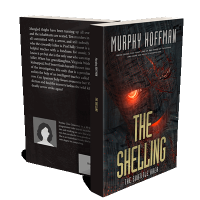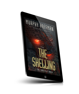 “A menacing robotic face with glowing red eyes is overlaid with digital circuitry. "The Shelling" is the prominent title in bold golden letters.”