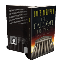 “A grand building with columns under a dramatic sky, featuring a large title: "The Falcon Letters."”