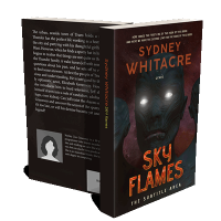 “A sci-fi book cover with alien figures and a fiery title "Sky Flames" against a cosmic background.”