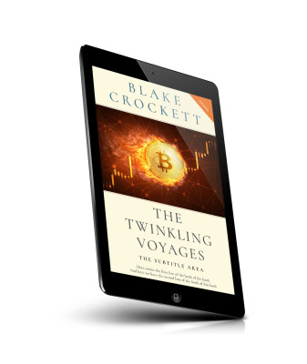 “A book cover featuring a golden Bitcoin symbol with a fiery background and financial chart, showcasing the title "The Twinkling Voyages."”