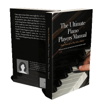 “A hand is playing a piano, and a title is displayed above the piano keys.”