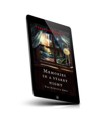 “A window view of a starry forest night, framed by curtains, with a book and a "Genre" badge nearby.”