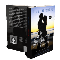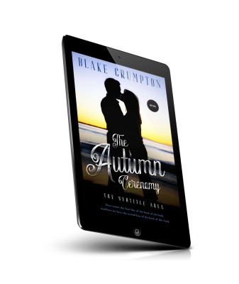 “A silhouetted couple stands on a beach at sunset. Text overlay includes the title "The Autumn Ceremony" and author's name.”