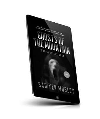 “A black and white book cover with an eerie face and the title "Ghosts of the Mountain." Author: Sawyer Mosley.”