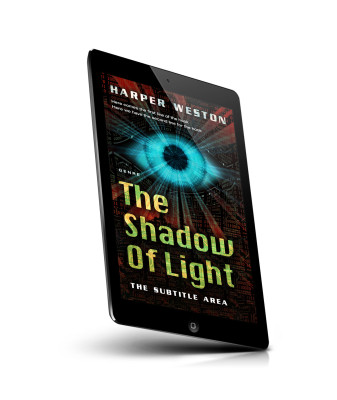 “A sci-fi book cover with a central glowing eye surrounded by digital patterns and binary code; the title is in bold yellow and green text.”