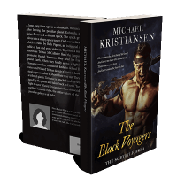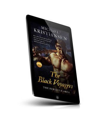 “A muscular man holding a sword stands aggressively in front of a dark background. The title of the book is "The Black Voyagers."”