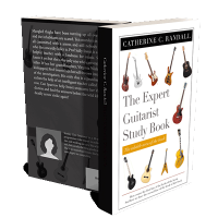 “Cover of a book titled "The Expert Guitarist Study Book," featuring various guitars and a genre badge.”