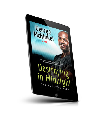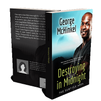 “A man with a confident smile, crossed arms, and a casual black shirt against a blue backdrop. Title: "Destroying in Midnight."”
