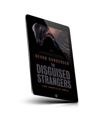 “A dark, menacing creature with a biomechanical appearance is shown alongside the title "The Disguised Strangers" and the author's name.”