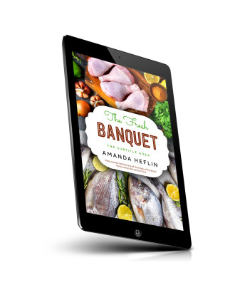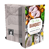 “A cookbook cover featuring raw chicken, fish, vegetables, and herbs, with a decorative title area in the center.”