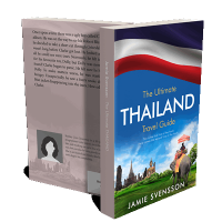 “A book cover featuring Thailand's flag, ancient ruins, a Buddha statue, and a person riding an elephant under a colorful parasol.”