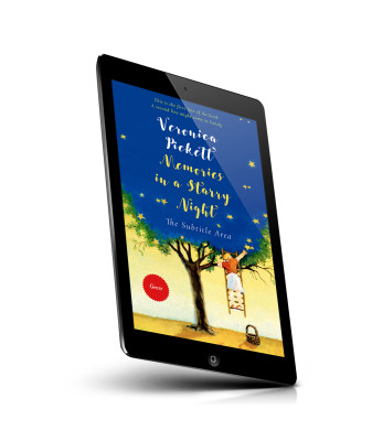 “A girl in a straw hat climbs a ladder leaning against a tree under a starry night sky.”