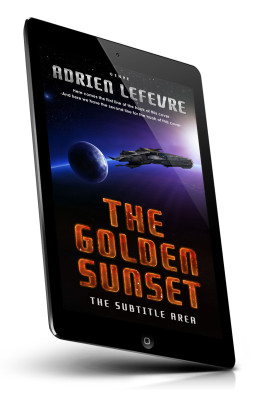“A spaceship hovers near a blue planet against a dark space backdrop. Bright orange text dominates the lower half of the image.”
