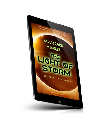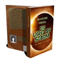 “A sci-fi book cover with a futuristic font, glowing backdrop, and the title "The Light of Storm" against a space-themed background.”