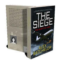 “A large airplane flies at an angle with smoke and fire in the background under the title "The Siege."”