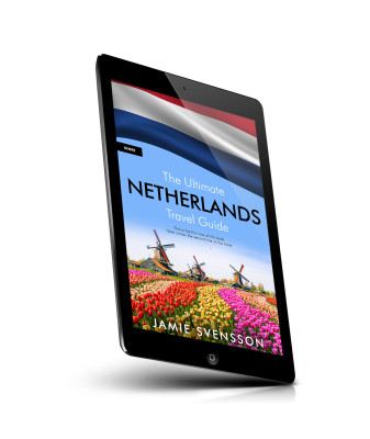 “A vivid travel guide cover featuring Dutch windmills and a colorful tulip field under a clear blue sky with the Netherlands flag at the top.”