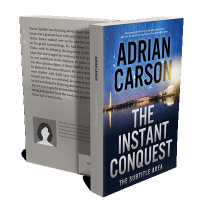 “Book cover showing a city skyline reflected on water, with the title "The Instant Conquest" in bold letters.”