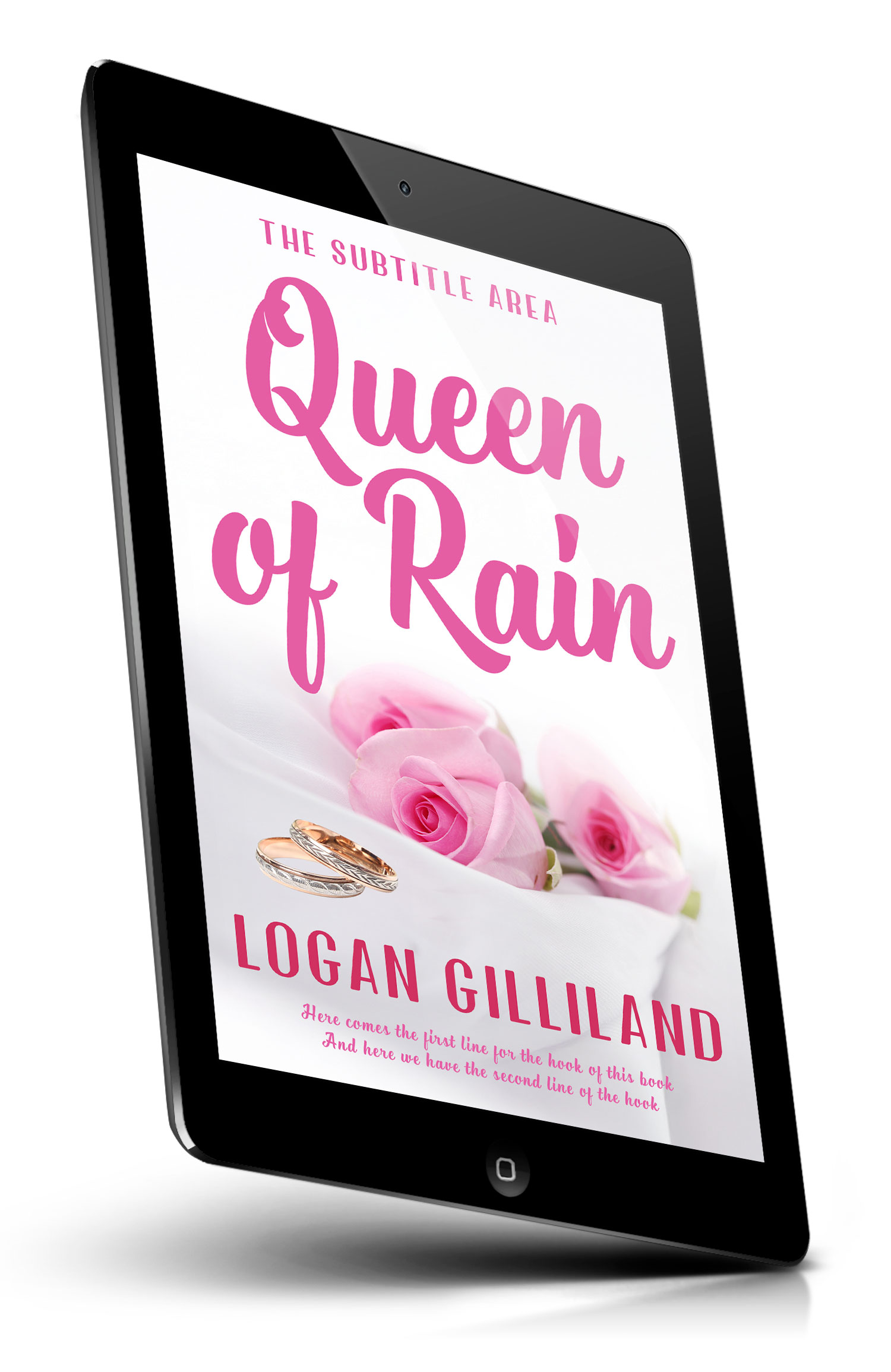 “Soft pink roses on white fabric with two wedding rings, styled like a romantic book cover in pink tones.”