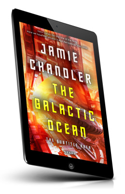 “A futuristic, glowing orange-red setting with a large, sleek spaceship docked among towering structures. Small figures stand nearby.”