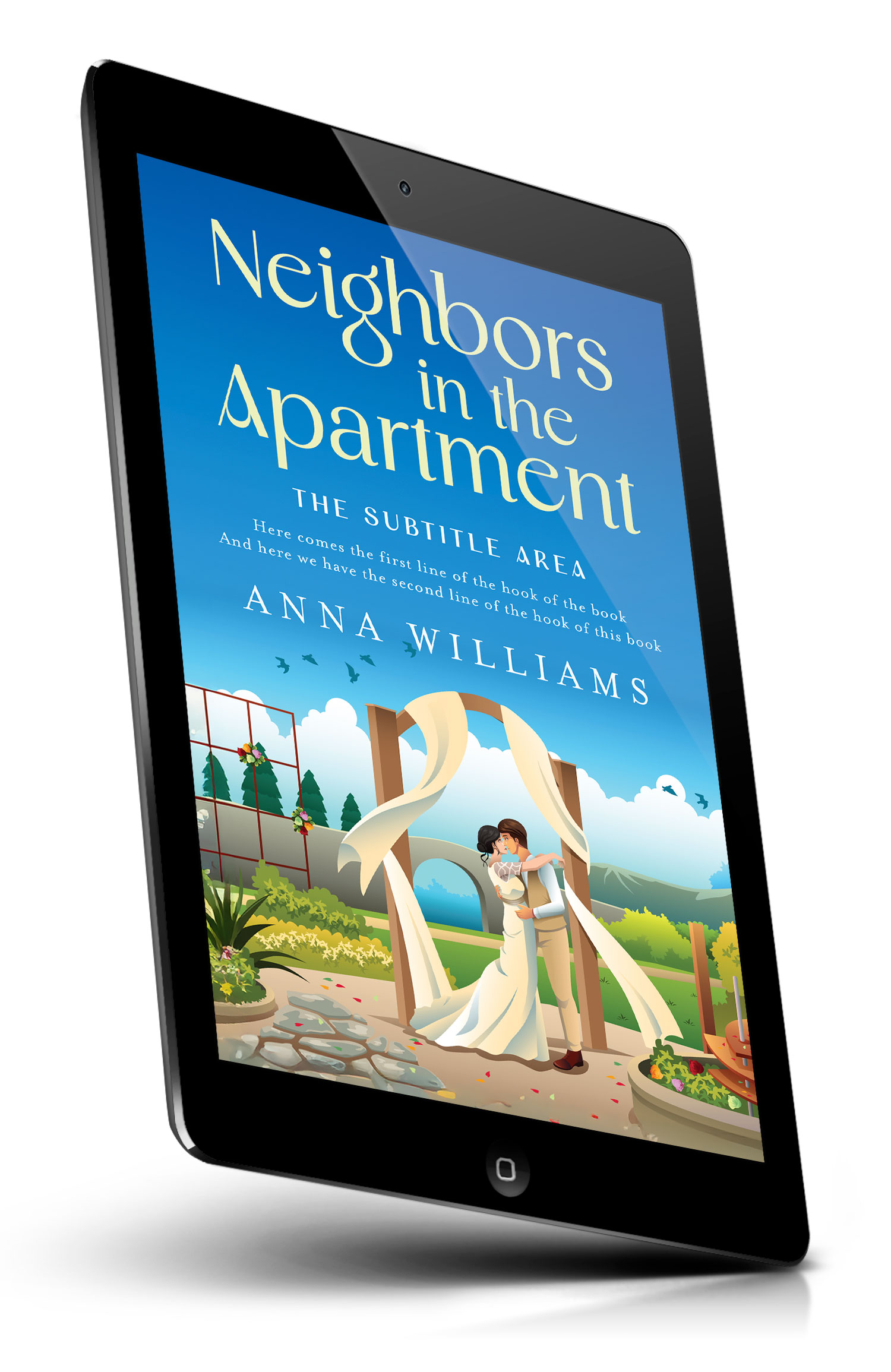 Tags: romance, wedding, bride, groom, newlyweds, kiss, embrace, bridal gown, wedding arch, flowing veil, garden, outdoor ceremony, floral decor, blue sky, birds, countryside, stone path, pastel colors, illustrated cover, romantic fiction