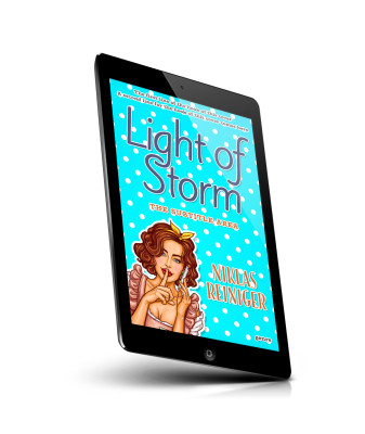 “A woman with curly hair and a finger to her lips against a blue polka-dot background. The title "Light of Storm" is prominent at the top.”